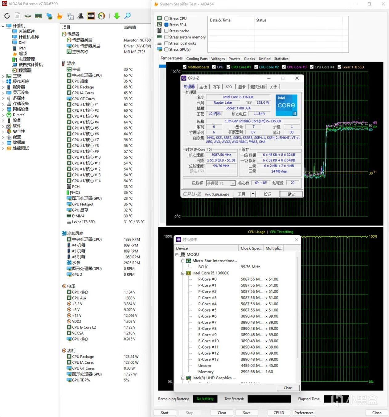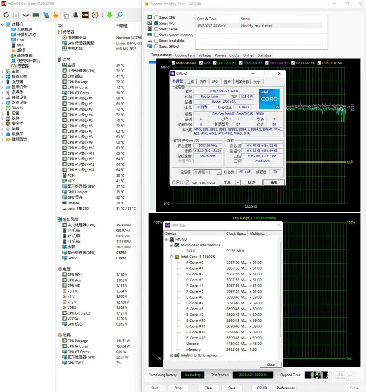 ▼單烤FPU測試,處理器功耗在155W左右,大核心睿頻5.1GHz,小核心睿頻3.9GHz,溫度在72℃左右,整體散熱表現非常好。喬思伯這款水冷的散熱表現,面對默頻的13700K也沒啥問題。