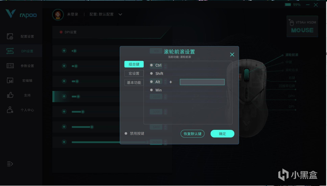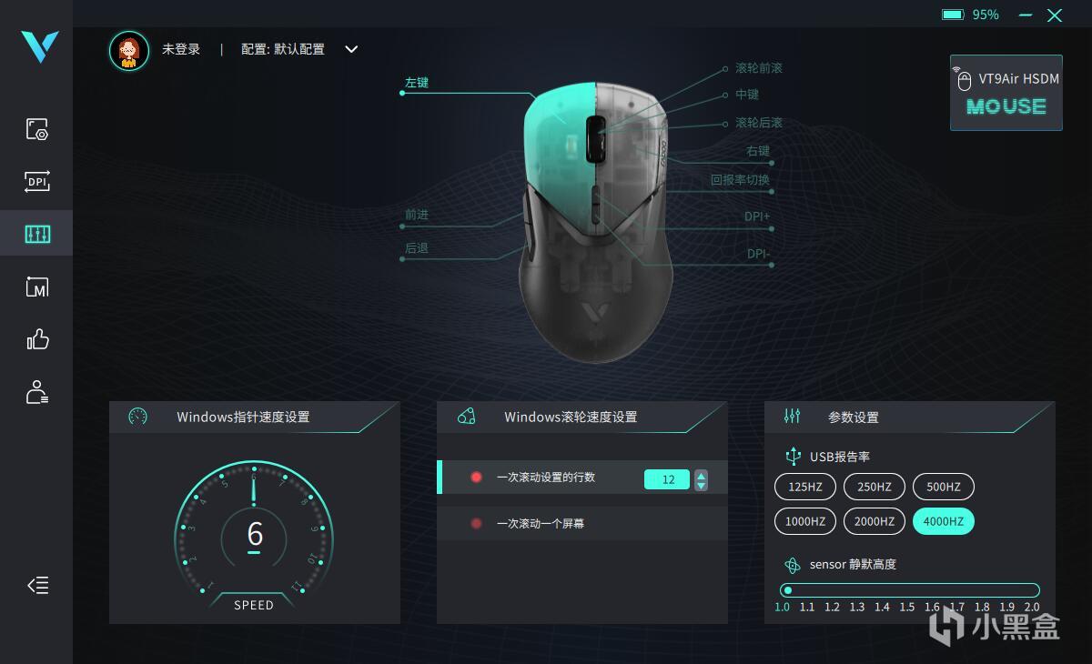 除了硬件方面配置出色,在軟件驅動方面,雷柏也是下了很大功夫進行優化,通過下載官方驅動後,可以連接看到以下界面,支持調節指針速度、滾輪速度、USB報告率、宏編程。還可以設置10個自定義按鍵的功能,同時還可以調節回報率以及Sensor靜默高度等信息。