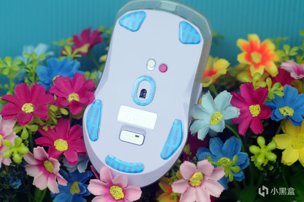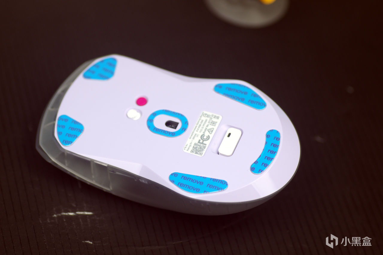鼠標底部配備了特氟龍墊腳,使用起來摩擦阻力很小,很絲滑。底部中央有一白一紅兩個按鍵,白鍵是滑動電源開關,紅鍵是DIY自定義鍵。