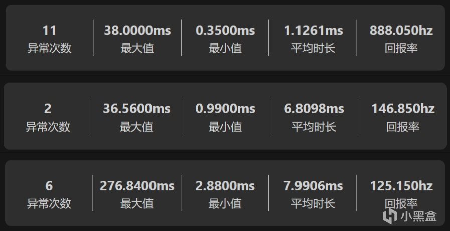 最後是回報率測試,多次實測。有線回報率平均值在900hz左右,無線回報率在150hz左右,2.4g回報率在125hz左右。圖中從上往下依次爲測試中某次有線、無線和2.4g的回報率數據。