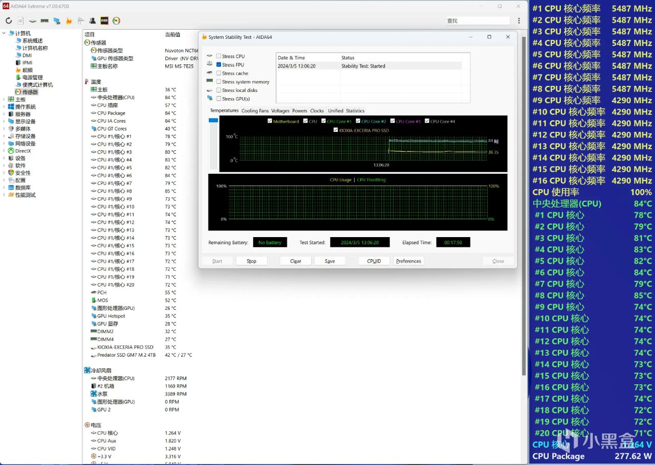 通過AIDA64單烤FPU,i7-14700K的核心電壓爲1.265V,功率達到了280W左右。核心溫度被壓制在84℃,表現很不錯。