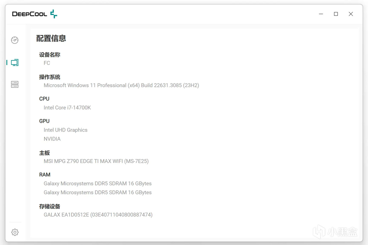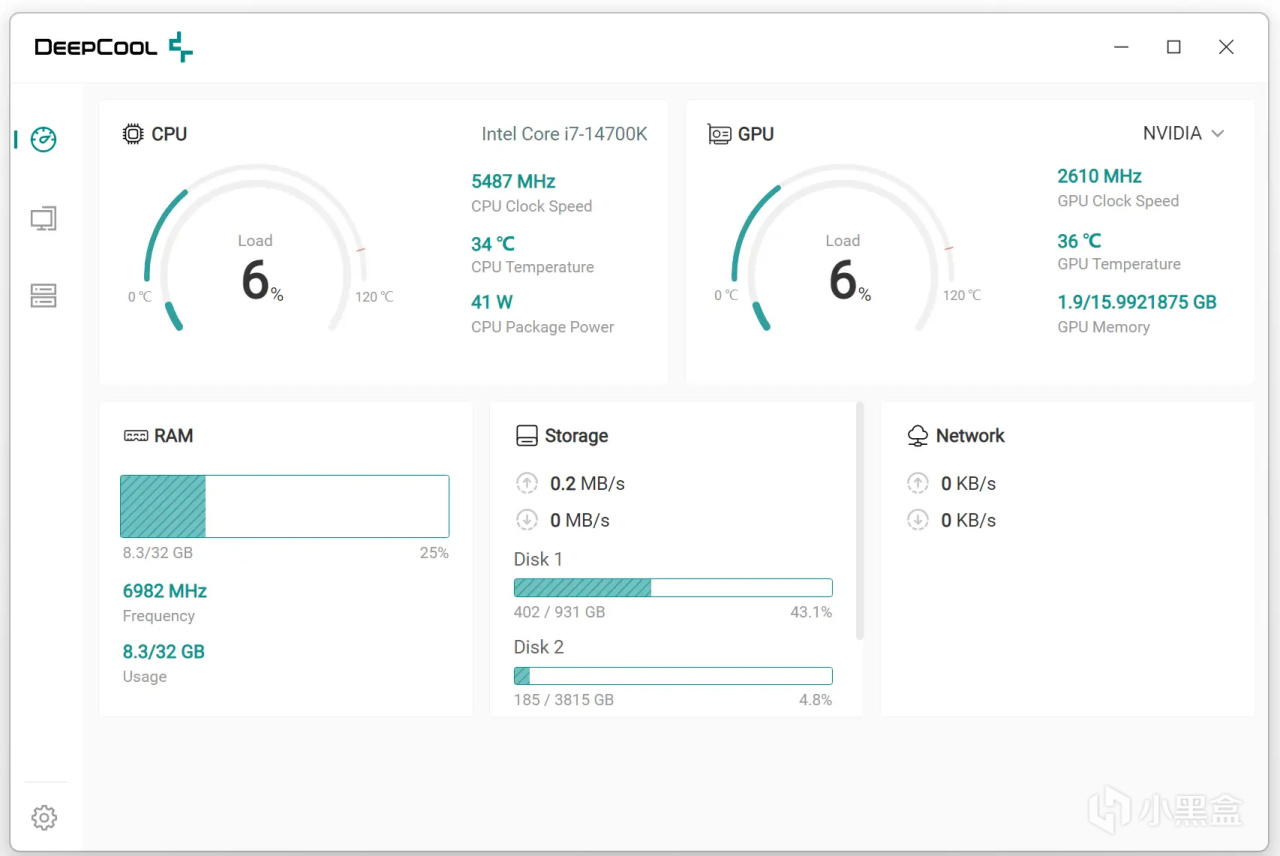 這裏也來詳細介紹下這套九州風神自研控制軟件。首先第一個界面的是硬件監控,包括CPU/GPU的頻率、溫度、功率;內存的使用率、頻率、硬盤佔用以及網絡使用率等,非常詳細且直觀。