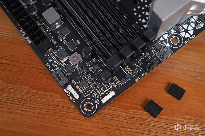 主板上沿 CPU FAN 和 AIO PUMP 4PIN 接口,出廠帶了保護套。右上角兩個 5V ARGB 接口,CPU OPT 4PIN 接口。