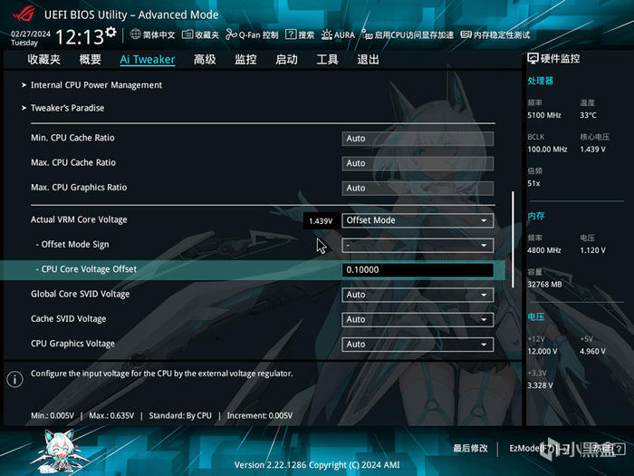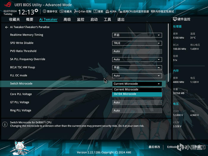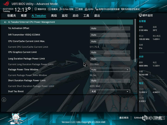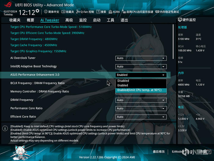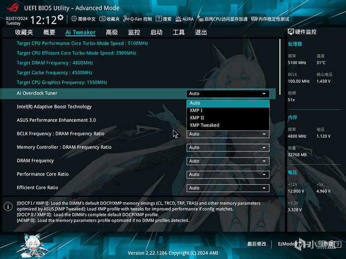 BIOS 界面默認爲吹雪定製版本,ROG 最近的新版 BIOS 中在 AI Overclock Tuner 中增加了 XMP Tweaked 選項,其相比 XMPⅠ和 XMPⅡ 會有着更激進的小參方案,當然對於 CPU 及內存的體制也有會一定的要求吧。