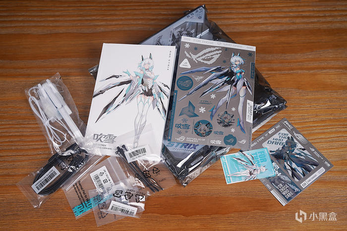 翻開所有的東西,主板本體、ROG 吹雪姬主題的貼紙、說明書、主題卡片、WI-FI 天線、SATA 數據線、M.2 導熱墊與固定螺絲、理線紮帶。