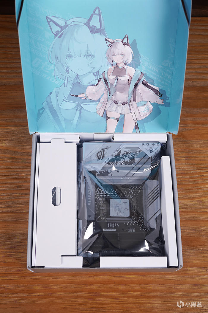 小吹雪 ROG STRIX B760-G GAMING WIFI S 外包裝延續之前的老款,正面冰雪場景,搭吹雪姬與主板渲染圖展示,型號及品牌標識採用鐳射印刷工藝處理。