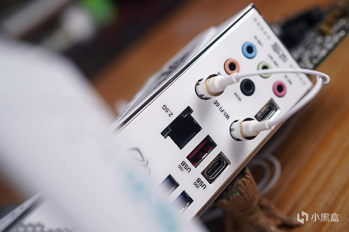 最後看看 I/O 接口,接口從左到右,DP/HDMI 視頻輸出接口、BIOS FLACK 更新按鍵( 對應第一個 USB 2.0 接口)、四個 USB 2.0 接口、兩個藍色 USB 3.2 GEN1 接口、一個USB 3.2 GEN1 Type-C接口、一個紅色 USB 3.2 GEN2 Type-A 10GB 接口、一個 USB 3.2 GEN2×2 Type-C 20GB 接口、2.5G LAN 接口、Wi-Fi 6E 網絡藍牙天線接口、音頻接口支持光纖輸出。