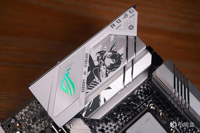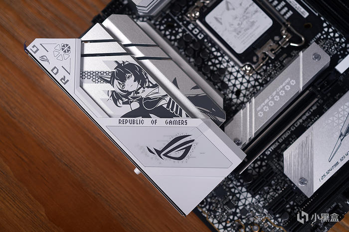 主板本體,採用的是標準 MATX 版型規格,黑色 PCB,銀白色的散熱馬甲採用機甲風格的斜面切割設計,模塊表面用了吹雪姬等元素裝飾點綴。