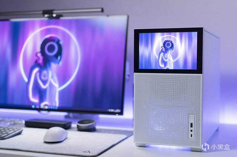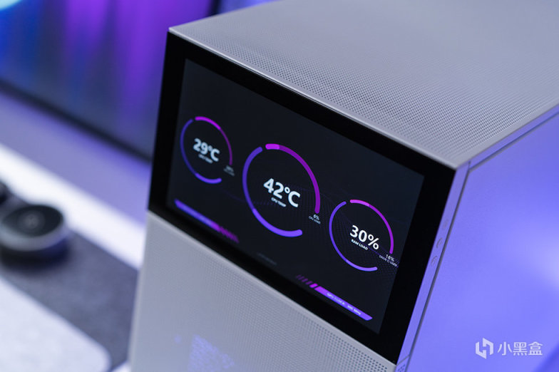 壓軸登場的就是我們這次的主角了,目前MATX機箱中的卷王:喬思伯 松果D31。作爲自己明星款的升級版本,D31增加了頂部對360冷排的安裝支持,去掉了圓潤的棱角過度外觀變得更加英朗,最大的變化是機箱正面採用上下分段的模塊化設計,上部分增加了一塊8英寸的屏幕,可搭配AIDA64顯示運行狀態貨設置成動態壁紙。下部分則爲mesh面板,進一步加大了通風效率。從背面可以看到,D31在最下面的PCI-E擋板上預留了HDMI及TYPE-C線纜的過線孔。