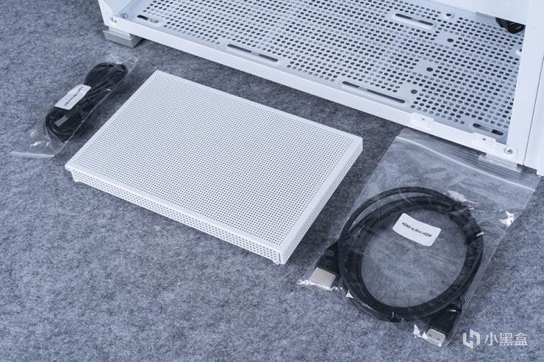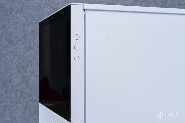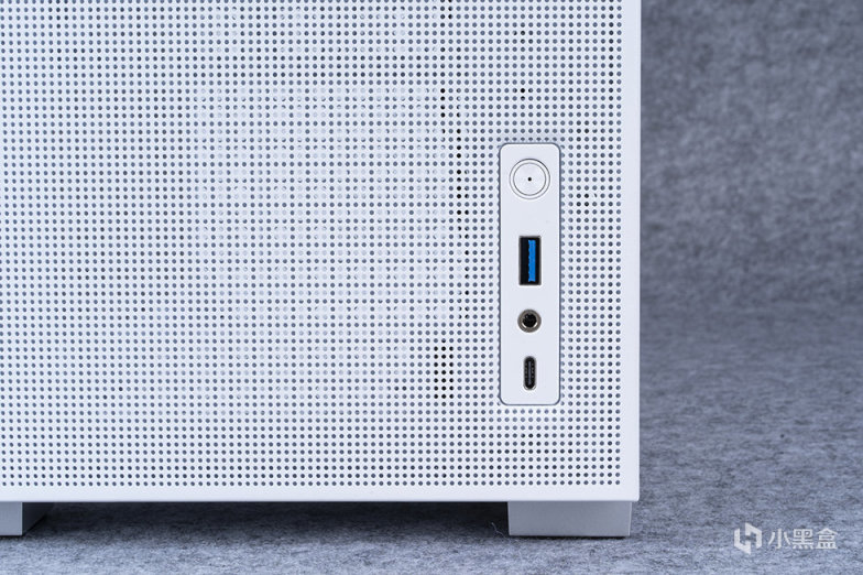 機箱的IO部分設置在正面右下角,從上到下以此爲:電源開關,USB3.0 TYPE-A,3.5mm音頻,USB-C 3.2 Gen 2(10GBps),屬於常規配置。