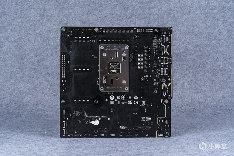 背面一覽,主板爲6層PCB製程,2oz厚鍍銅,均採用雙倍ESD焊點,整體用料十分紮實。線路佈局清晰,中央碩大的長方形AM5底座,支持AM4散熱扣具。
