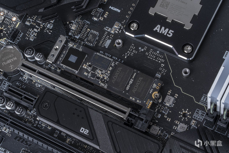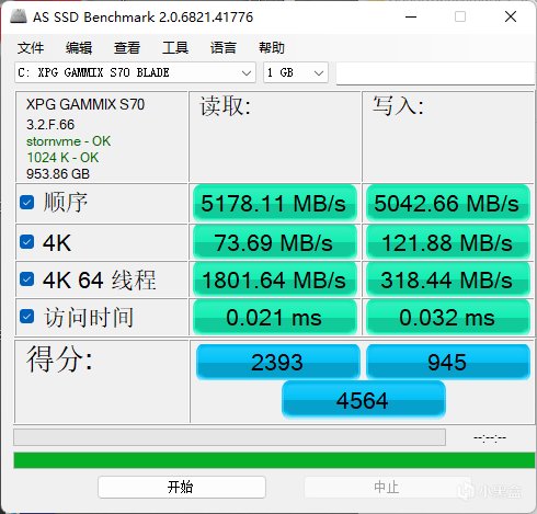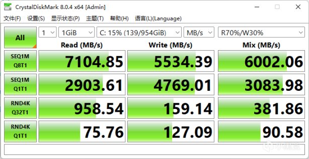 SSD採用XPG的S70 BLADE,PCIe4.0,M.2規格,官方標稱順序讀取速度爲 7400MB/s,順序寫入速度可達 6400MB/s。隨機性能方面,4K 隨機寫入速度最高 740K IOPS,4K 隨機讀取速度最高 650K IOPS。