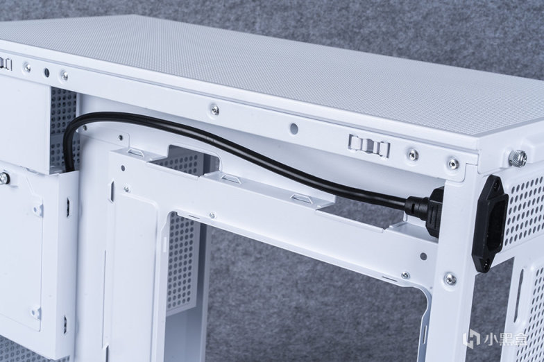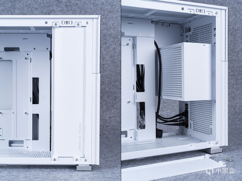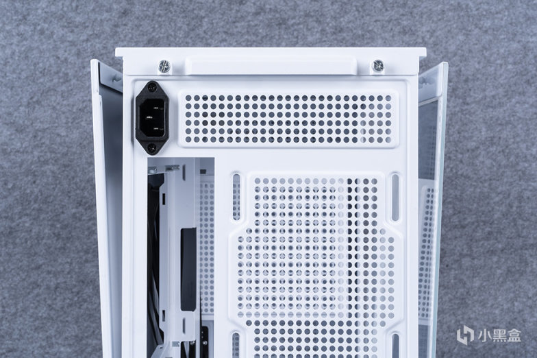 機箱前部電源位和D30一樣帶有裝飾蓋板,不過取消了SSD的安裝孔位,拆除後可以看到電源安裝位,電源爲支持4級高度調節,可根據配置調節電源安裝高度。最大支持18cm的電源和335mm長度的三槽顯卡(頂部無法安裝360水冷),在安裝標準14cm的ATX電源時可支持360水冷及335mm的顯卡。