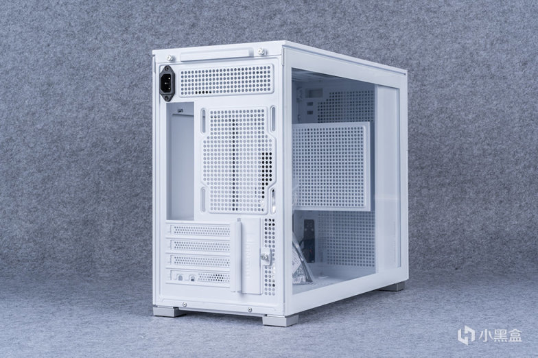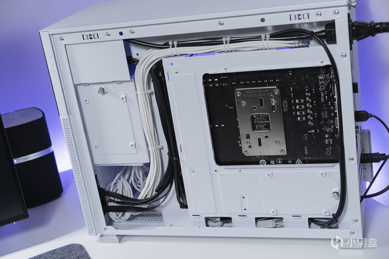 機箱的背面,主板區域採用大面積開放設計,更方便扣具的安裝。圍繞主板區域,設置了7處過線孔和18個理線橋,同時35mm深度的藏線空間,大大的優化了理線過程。