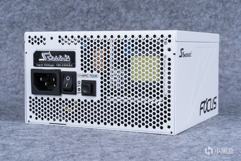 電源的背部是大面積的鏤空設計,有助於散熱,附有金屬LOGO銘牌,下面依次是電源插口、開關和Hybrid MODE開關,支持第三代溫控技術,40%負載下風扇啓停。