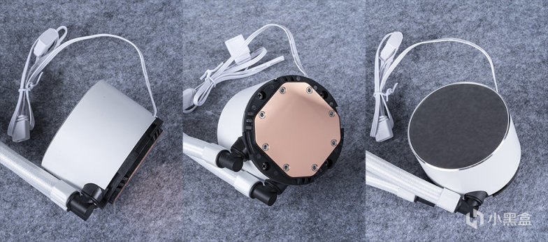 冷頭外罩爲經過陽極噴砂的全鋁合金材質,質感很細膩,頂蓋爲高強度亞克力,鏡面電鍍反射工藝,通電後帶有無限鏡效果,採用0.10mm間距微水道工藝的全紫銅鏡平面底座。