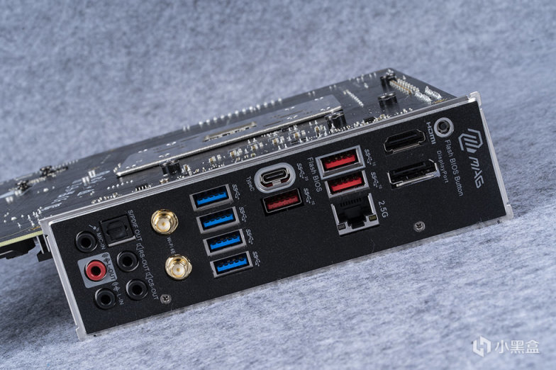 微星MAG B650M MORTAR WIF背部,預裝一體I/O護盾,IO接口相對還是很豐富的,包括:Flash BIOS 按鍵、1個DP1.4接口、1個HDMI2.1接口,3個USB 3.2 Gen 2 10Gbps (Type-A)接口、4個USB 3.2 Gen 1 5Gbps(Type-A)接口、1個USB 3.2 Gen 2x2 20Gbps (Type-C)接口、2.5G網絡接口、Wi-Fi 6E天線接口、以及音頻接口。
