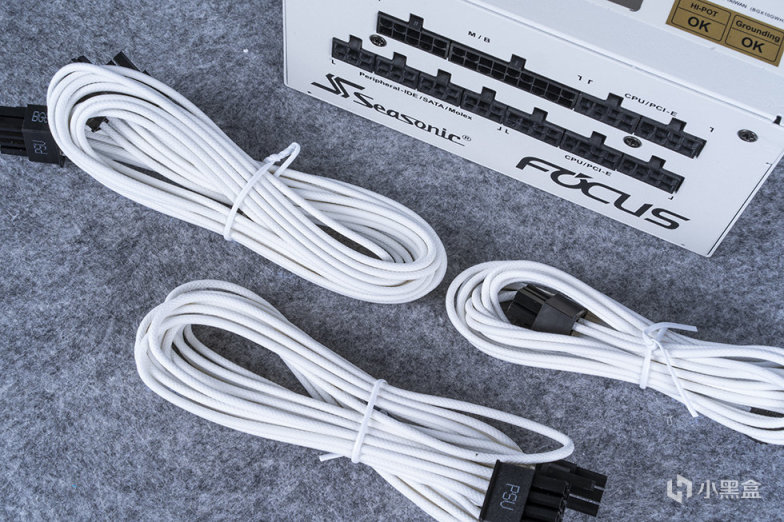 模組線一共有11條,分別爲1條24pin主供電,2條4+4pin CPU供電、3條6+2pin PCI-E供電、1條D型4pin以及2條SATA接口。均爲白色壓紋線,規格採用足料銅芯的16AWG線徑以及耐高電流鍍金端子,省去了定製模組線的額外開支。