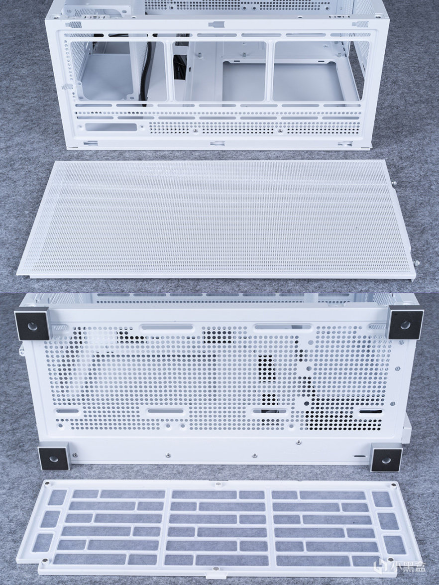 機箱上方也是mesh面板設計,擰掉尾部的2顆螺絲後可以拆除,頂部有冷排及風扇安裝位,最大支持360水冷或3*120mm的風扇安裝,頂蓋個冷排之間留出了12mm的出風氣流緩衝區,可有效降低風阻和風噪。機箱底部也是大面積的開孔設計,支持3*120mm的風扇安裝,並帶有磁吸式尼龍防塵網。