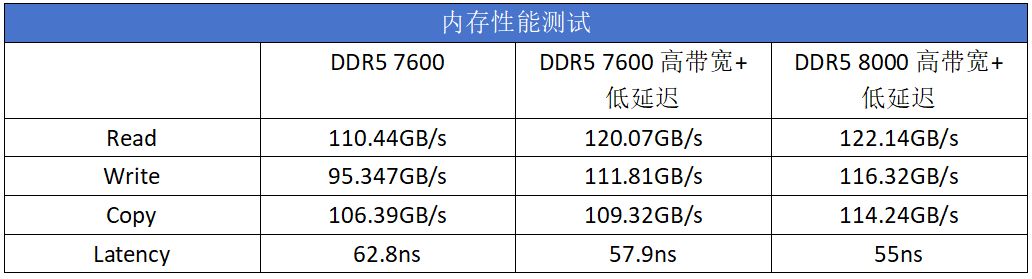 接下來我們也嘗試對內存進行超頻,在保持時序參數的前提下,輕鬆將內存超上了8000MHz,運行測試也十分穩定。在更高的頻率並開啓了內存高帶寬和內存低延遲技術之後,此時內存的讀取速度達到了122.14GB/s、寫入速度爲116.32GB/s、拷貝速度爲114.24GB/s,延遲進一步下降到55ns。