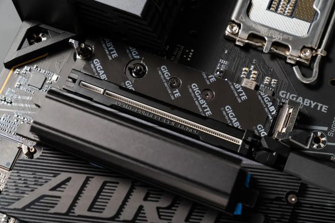 擴展部分,技嘉Z790小雕X的主顯卡插槽支持PCIe 5.0,而且還加入了無縫一體式設計、橡膠內襯條、鋅合金等超耐久用料,抗干擾能力和承載能力更強,爲顯卡提供更好的保護。主板還提供了多達4個M.2 SSD插槽,其中1個基於CPU另外3個基於主板芯片組,均支持PCIe 4.0×4通道,豐富的接口充分滿足了用戶對於高速存儲設備的安裝需求。所有M.2插槽都覆蓋有散熱片,在插槽部分加入了一體式抗干擾金屬遮罩,最大限度地提高了信號的完整性。