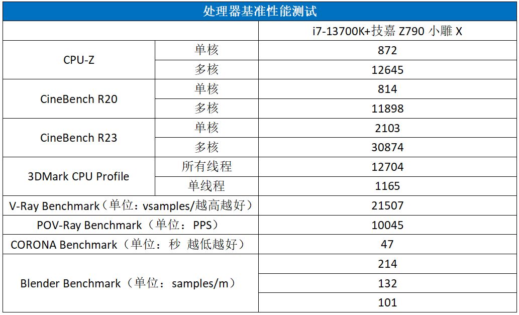 得益於強悍的供電以及散熱配置,安裝在技嘉Z790小雕X上的i7-13700K不管是《CPU-Z》《Cinebench R20》《Cinebench R23》等基準測試軟件還是《V-Ray Benchmark》《CORONA Benchmark》《Blender Benchmark》等專業軟件中,都取得了較高的分數,可以說發揮出了全部的性能。