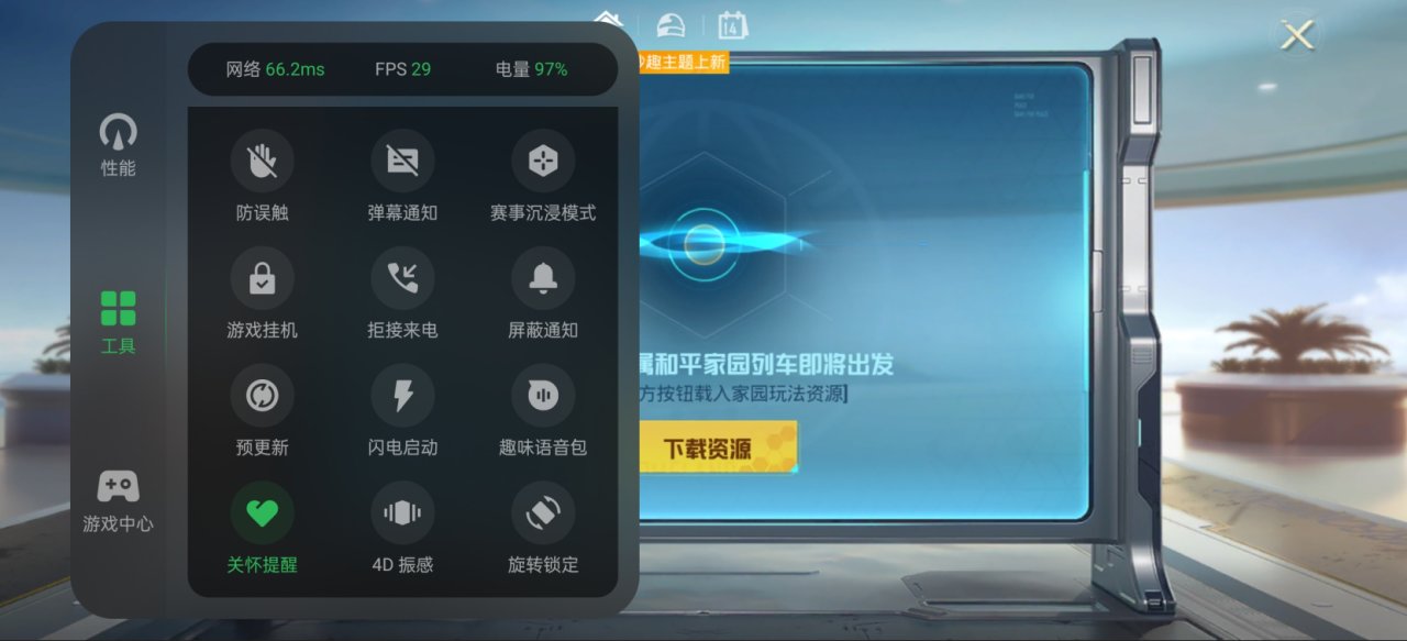 ▲在遊戲畫面中,可以在屏幕左側邊緣向右滑動呼出遊戲輔助功能,其中可以對手機的性能進行調整,或者打開各種輔助工具。