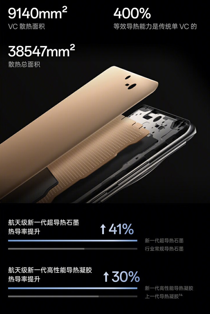 ▲散熱方面,一加12搭載了行業超大的萬級 VC(9140mm²),散熱結構也經過了再度優化,擁有38547m㎡的超大散熱總面積,所使用的超導熱石墨。