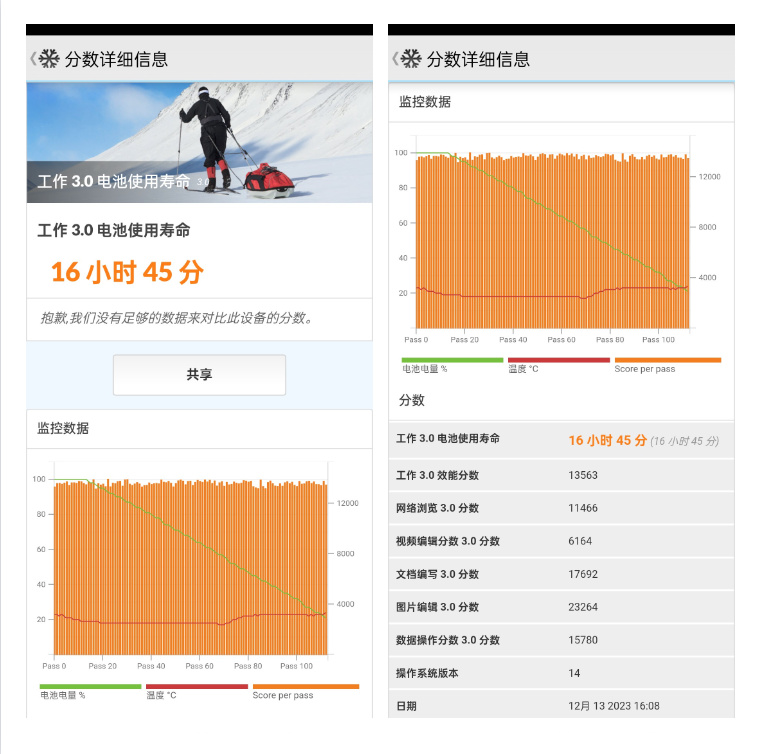 ▲續航方面,一加12配備了5400mAh的我通過PCmark 安卓版實測,一加12可以提供16小時45分的綜合使用時長,持久度真的很OK,再配合上長壽版100W超級閃充,約26分鐘即可爲手機充滿電,50W的無線閃充還支持反向充電,給耳機等小件充電十分方便。