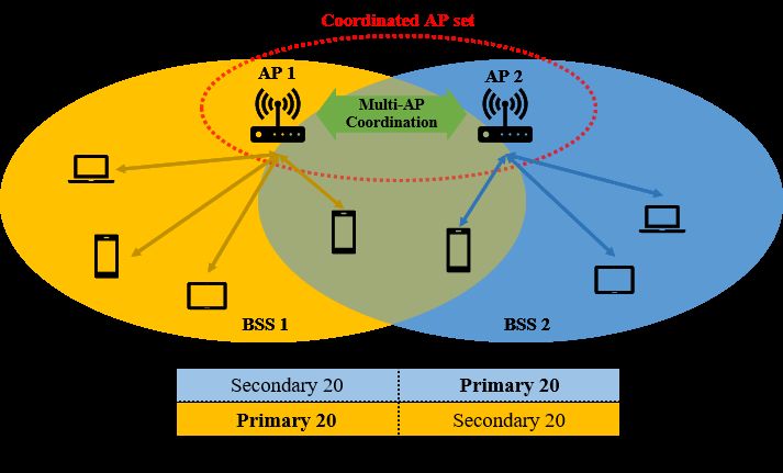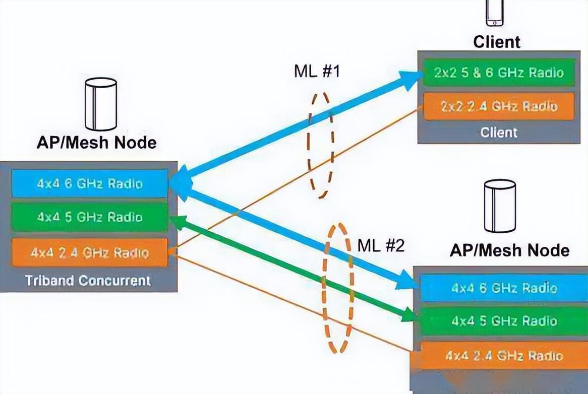 MLO可以在不同的波段和信道中創建多個鏈路(無線電)的捆綁或綁定,作爲連接對等體之間的一個虛擬鏈路。每個鏈路(無線電)可以獨立和同時與其他鏈路工作,或協調最佳的聚合速度、延遲、範圍(覆蓋)或節省電力。