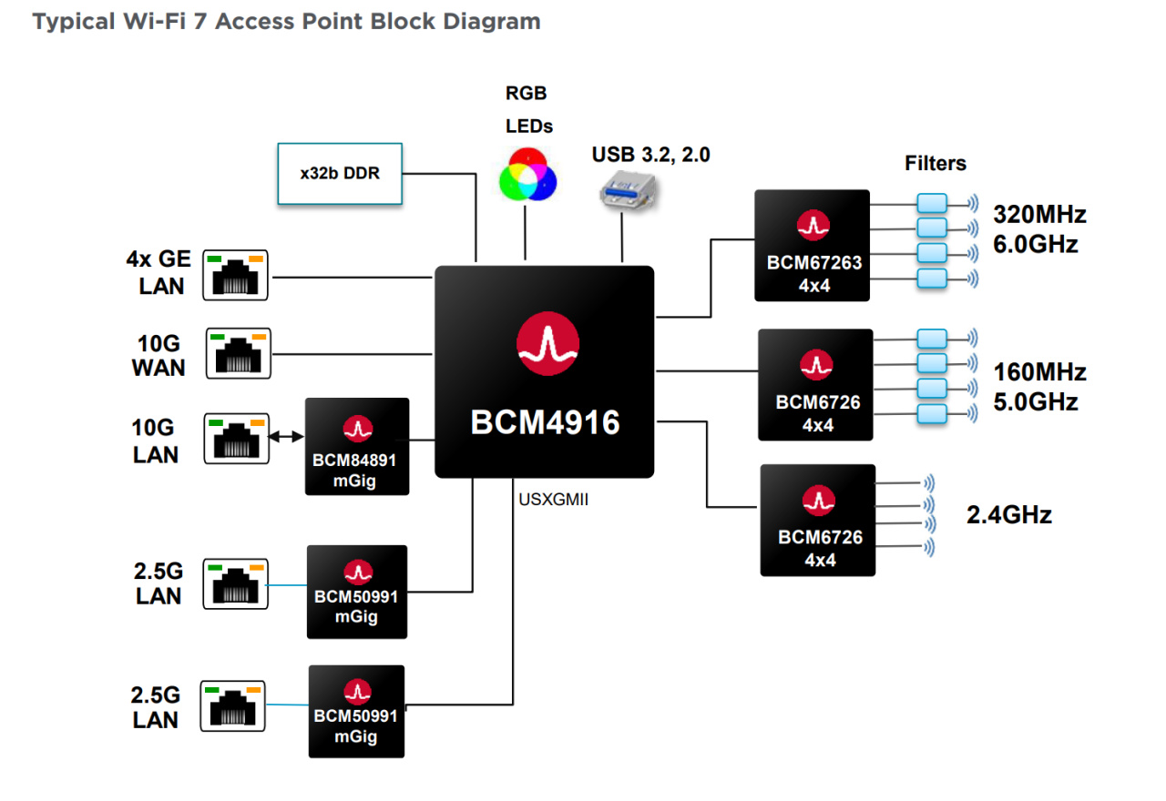在博通官網查詢BCM4916的接口圖示,可以看到其原生提供了1個萬兆WAN口+4個千兆LAN口,同時還擁有3條USXGMII 10G接口,分別轉接出1個萬兆LAN口和4個2.5G LAN口;極限情況下,應該還能再轉接出4個額外的2.5G LAN口。