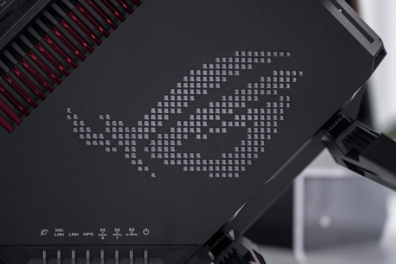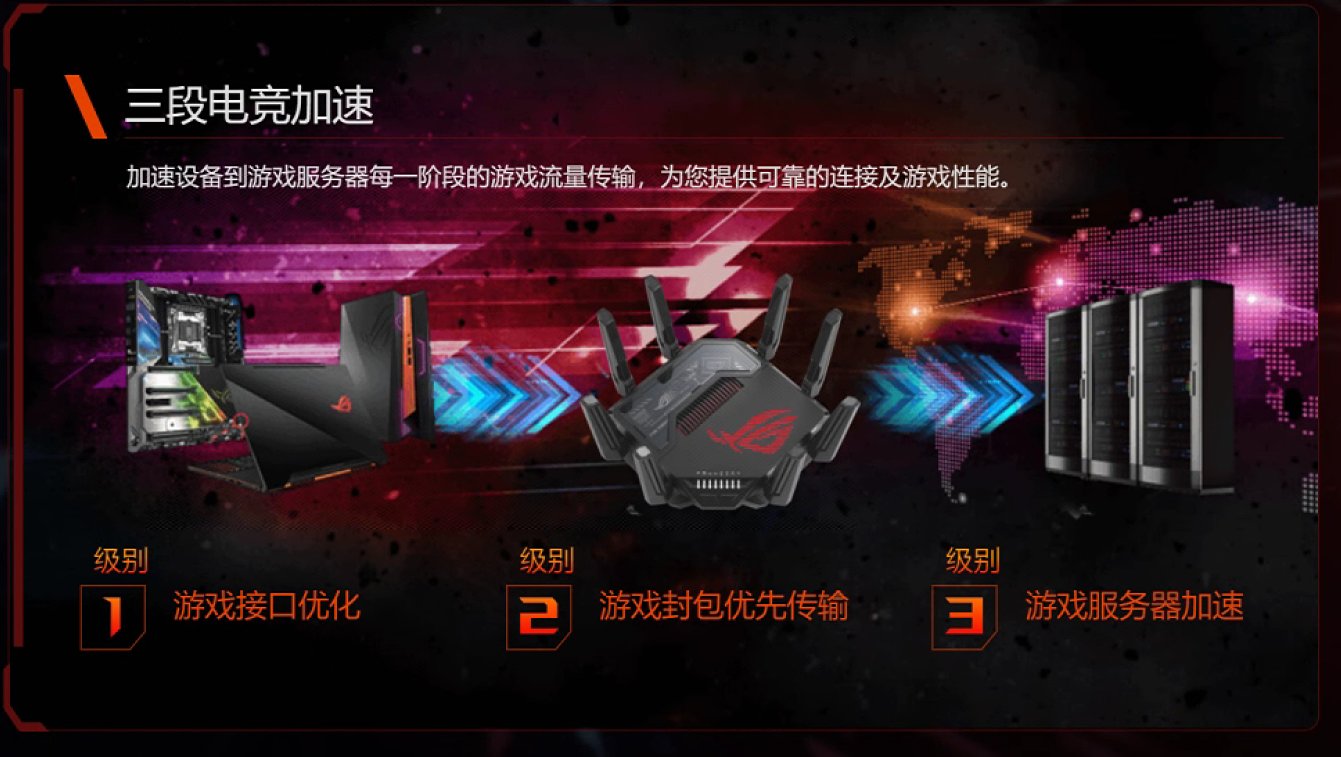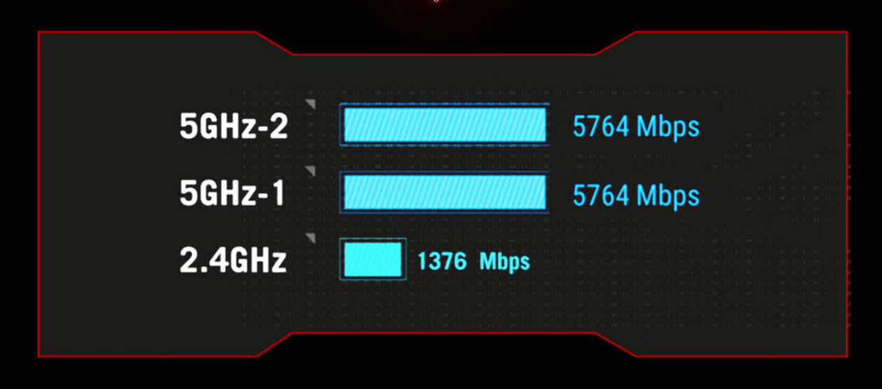 ROG GT-BE96爲大陸專屬版的八爪魚7,擁有2.4GHz+5.2GHz+5.8GHz三個頻段,其中2.4GHz頻段的峯值帶寬爲1376 Mbps,兩個5GHz頻段的峯值帶寬均爲5764 Mbps,三者合計12904Mbps的總帶寬,非常驚人。向此類旗艦款的三頻路由器,多出來的5GHz頻段不僅可以用來組建無線回程Mesh網絡,還可以單獨劃出來用於電競娛樂,可以最大限度地避免干擾和延遲。
