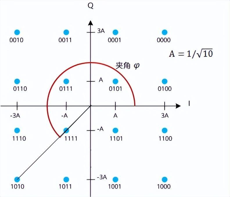 星座圖上的每一個點,都表示一個符號。該點I軸和Q軸的分量分別代表着正交的載波上的幅度調整。該點到原點的距離A就是調製後的幅度,夾角φ就是調製後的相位。