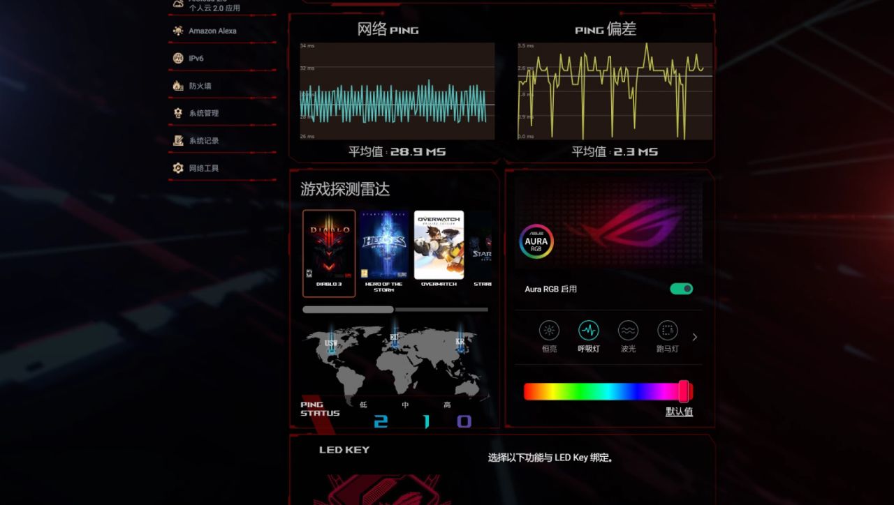 例如,在後臺管理界面我們直觀觀察當前網絡的流量、延遲等信息,還能通過遊戲探測雷達功能檢測部分遊戲連接外網服務器的質量,同時還可設置LED點陣的RGB燈效。