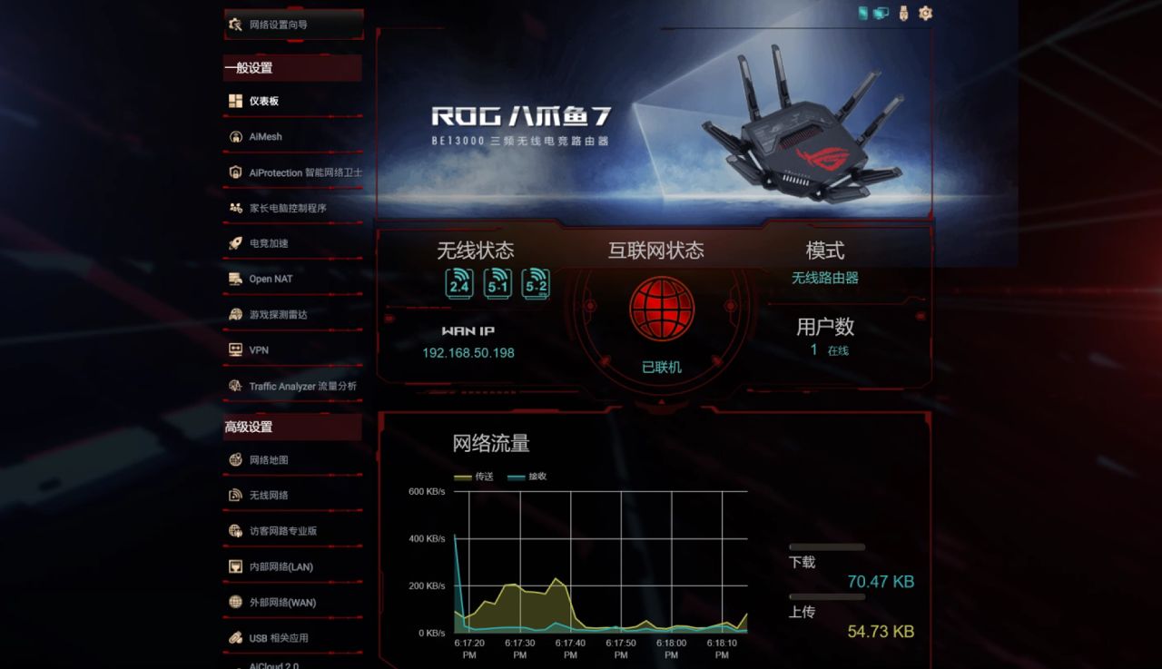 與普通的華碩路由器不同,ROG GT-BE96的專屬固件UI也是霸氣側漏,不僅在固件首頁儀表盤驕傲地展示着自身霸氣身姿,還擁有更加豐富的功能和可選項。