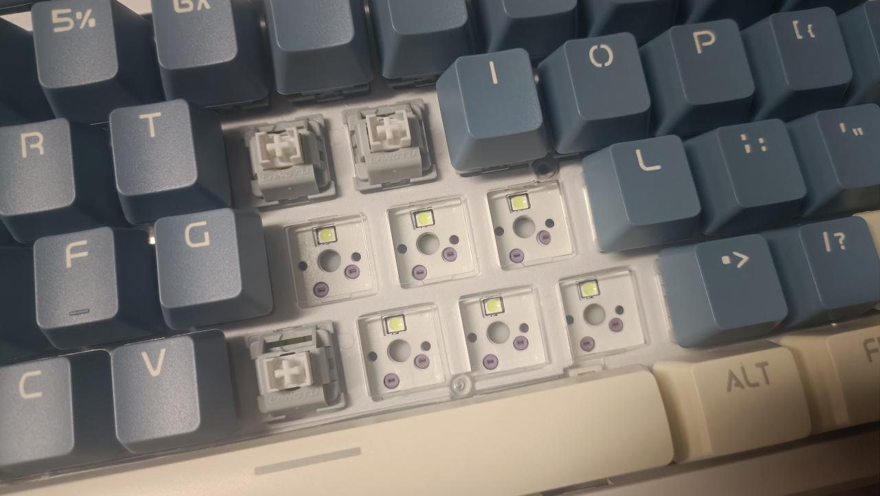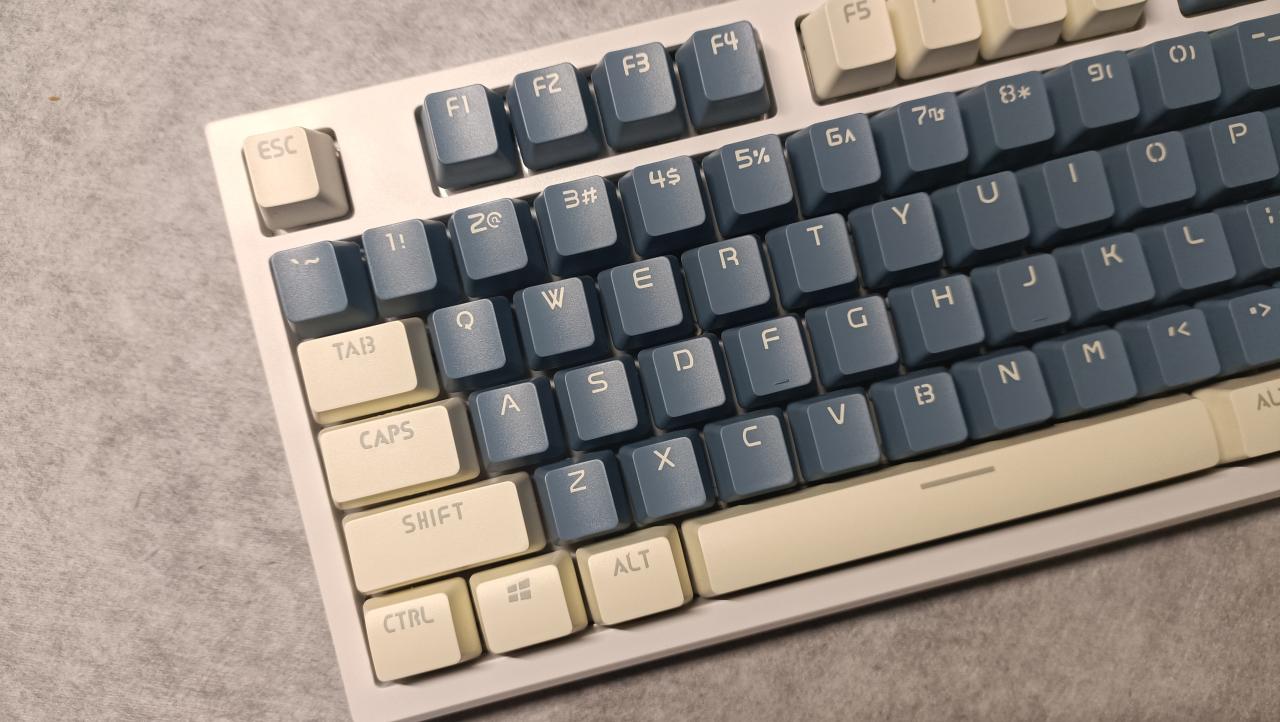 我手裏的這把配色爲拂曉配色,也有另外冰藍與暮夜配色,我這把整體爲米白色,字母區與部分f區和方向鍵用靛藍色作爲點綴,看着非常協調,觀感舒適。