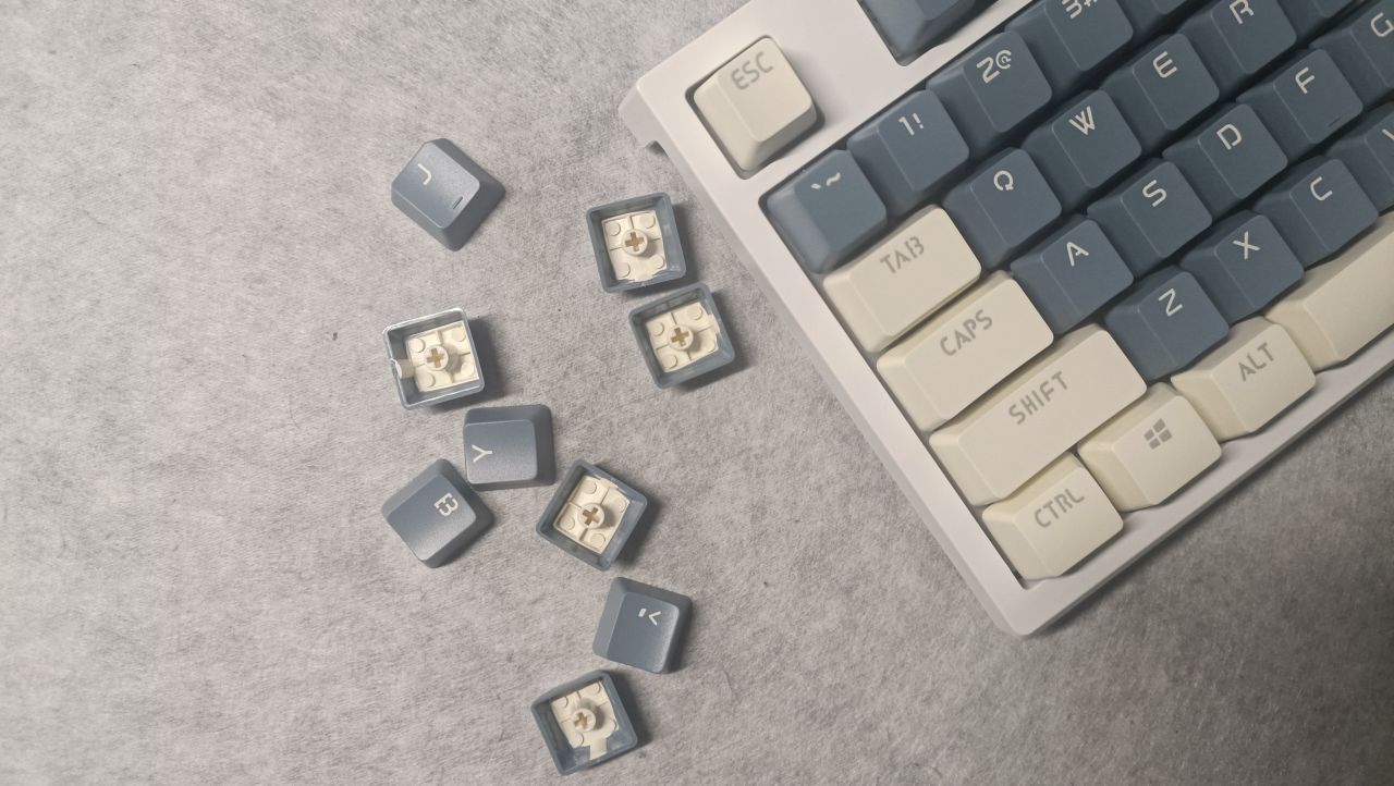 拂曉的鍵帽有米黃色與靛藍色兩種,爲內外兩層拼接的雙色注塑ABS材質,閉口字符,觸摸起來非常細膩,OEM高度,打字時挺舒適,材質強度較高,耐用且不易掉色。
