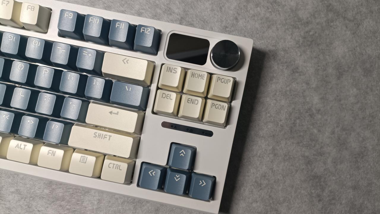 鍵盤的右側便是亮點之一,指示燈放在了控制區與方向鍵之間,稍微有點點漏光,而在控制區上方有一塊連接即亮的Logo小屏幕,同時也有數顯屏可選,雖然並非高價產品可有自定義屏幕內容等功能,但帶有小屏幕這一點還是非常值得稱讚的。