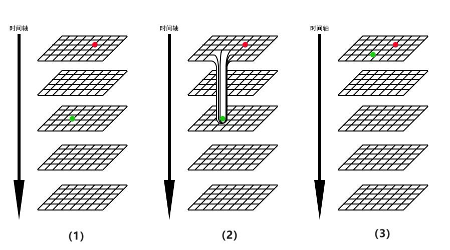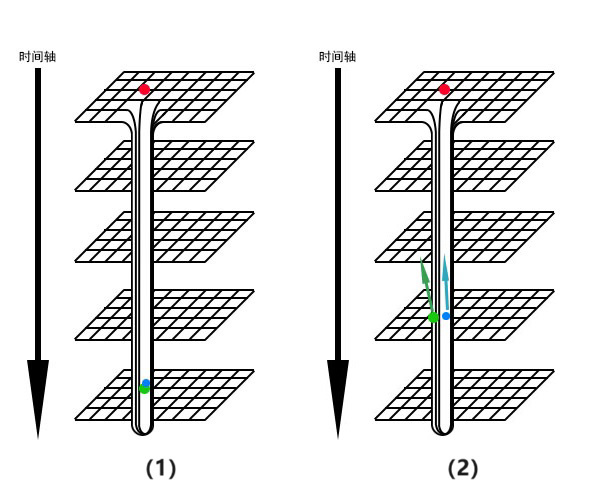 圖II。 (1)在“書本”的第一頁(現在)有一個紅點,第三頁(未來)有一個綠點。 (2)紅點舉行了儀式,在自己的書頁上開了一個直達第三頁的洞,這個洞的末端通向第三頁上綠點的位置。 (3)儀式結束,綠點沿着這個洞從第三頁跑到了第一頁,補上了洞本身。現在,紅點和綠點都在第一頁上了。