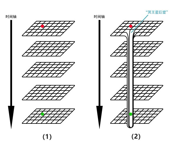 圖III。 (1)在“書本”的第一頁(現在)有一個紅點(現在的地球),第五頁(未來)有一個綠點(未來的地球)。 (2)紅點上面舉行了儀式,在自己的書頁上開了一個直達第五頁的洞,這個洞的末端通向第五頁上綠點的位置。但這次這個洞太大了,開口合不上,於是就留下了一個貫穿所有書頁的“隧道”,它的入口處被稱爲“冥王星巨壁”。