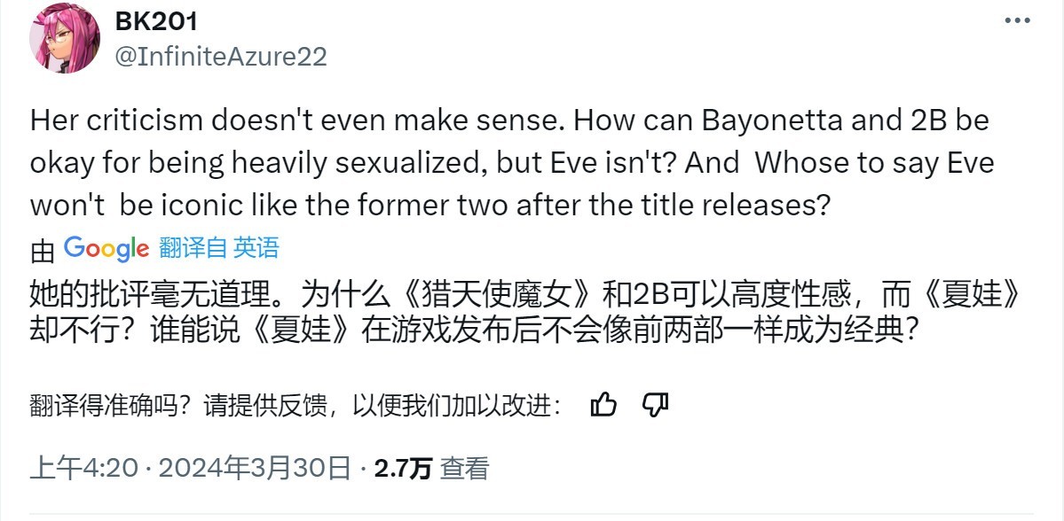 IGN法國在文章中提到,其他遊戲也選擇突出其女性角色的優勢,如《獵天使魔女》和《尼爾:自動人形》。然而,對於《星刃》中的Eve,IGN法國卻持批評態度,認爲她只是一個被從未見過女人的男人性化的玩偶。這種評價顯然帶有強烈的性別偏見和主觀色彩,缺乏客觀性和公正性。