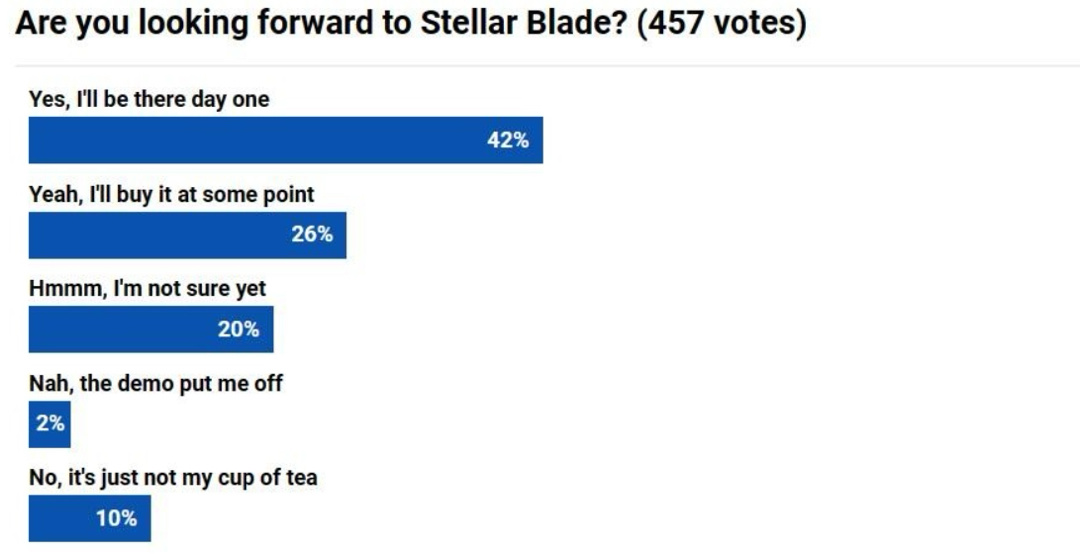 3、外媒《星刃》Demo反響調查:超四成玩家計劃首發購買 《星刃》試玩Demo昨晚上線,提供約一個小時的內容。隨着4月份發佈日期臨近,外媒Pushsquare進行了調查。共有493人蔘與“你在玩《星刃》Demo麼?”投票,33%已通關,38%打算玩,10%可能會玩;457人蔘與“你期待《星刃》麼?”投票,42%打算首發購買,26%會在某個時間購買,20%處於搖擺不定狀態。