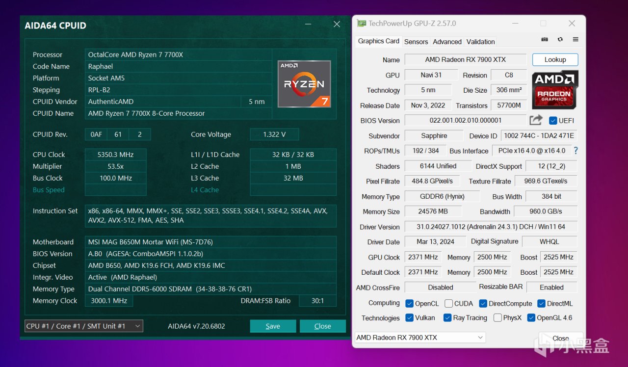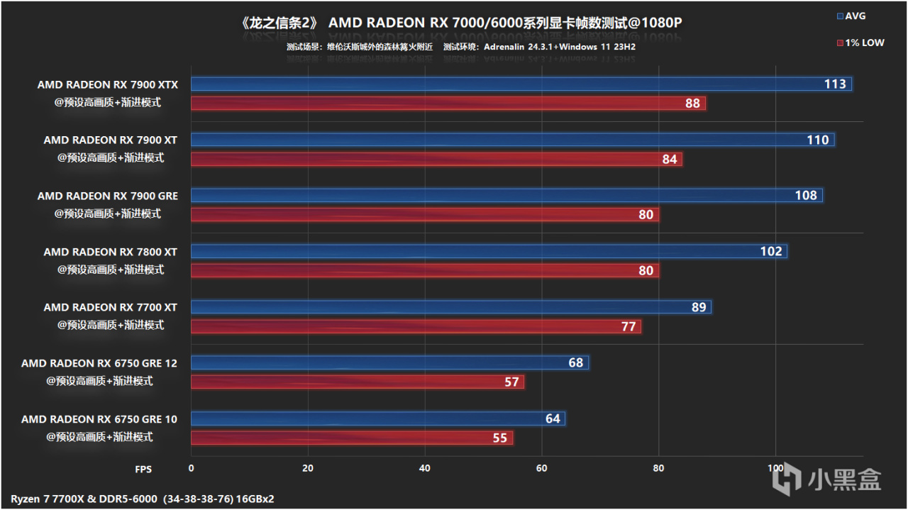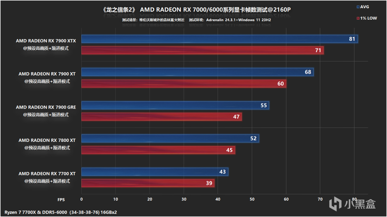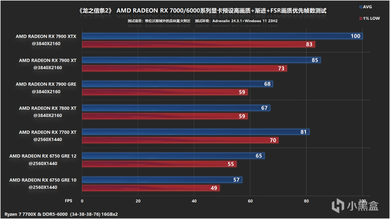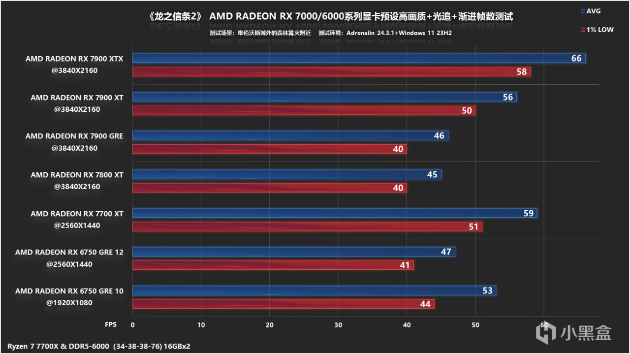 本次測試安裝的是AMD Adrenalin 24.3.1最新版本顯卡驅動(爲《龍之信條2》提供性能優化),操作系統是Windows 11 23H2最新版本,設置處理器銳龍7 7700X開啓PBO技術,搭配兩根DDR5 6000C34 16GBX2組成雙通道內存,並在BIOS中開啓Resizable BAR技術提升一些顯卡性能。