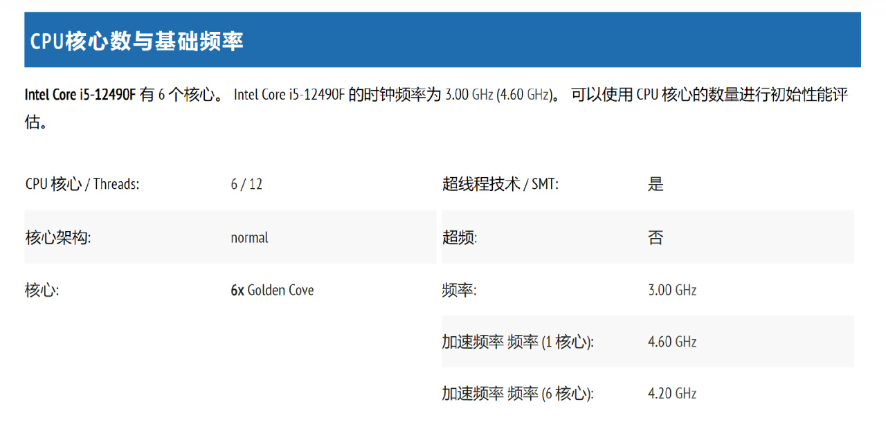 i5 12490F採用了6核心12線程的配置,單核最高睿頻4.6GHz,全核最高睿頻4.2Ghz。由於沒有采用大小核心混搭的異構架構,這就意味着i5 12490F並不需要搭配Win11系統來實現大小核的複雜調度,可以使用更符合咱們使用習慣的Win10系統來暢玩遊戲。