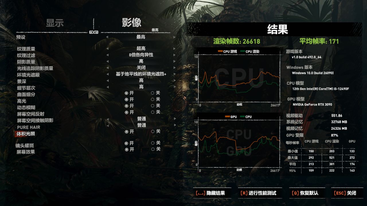 在 2K 分辨率下,將《古墓麗影:暗影》設置爲最高畫質檔位,測得平均幀率達到了171幀,已經可以完全發揮高刷顯示器的性能了: