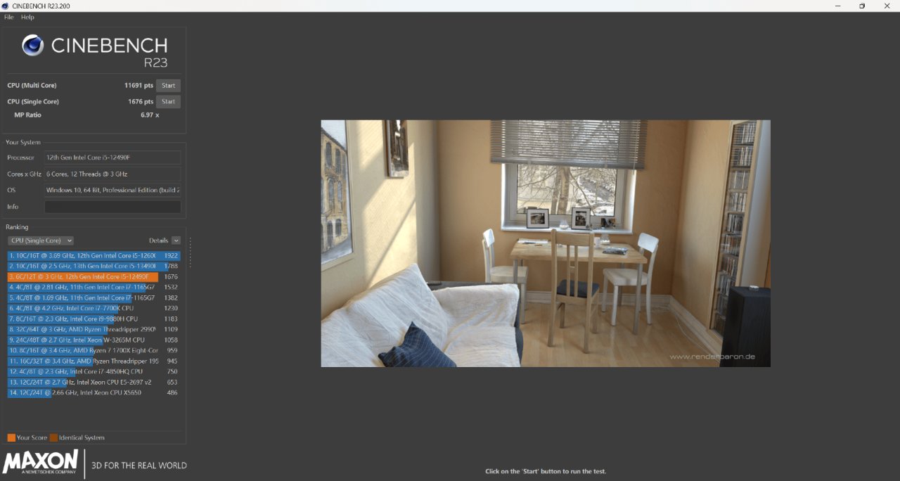 接下來我們通過 CINEBENCH R23 來測試一下,i5 12490F單核得分 1676分,多核得分 11691分:
