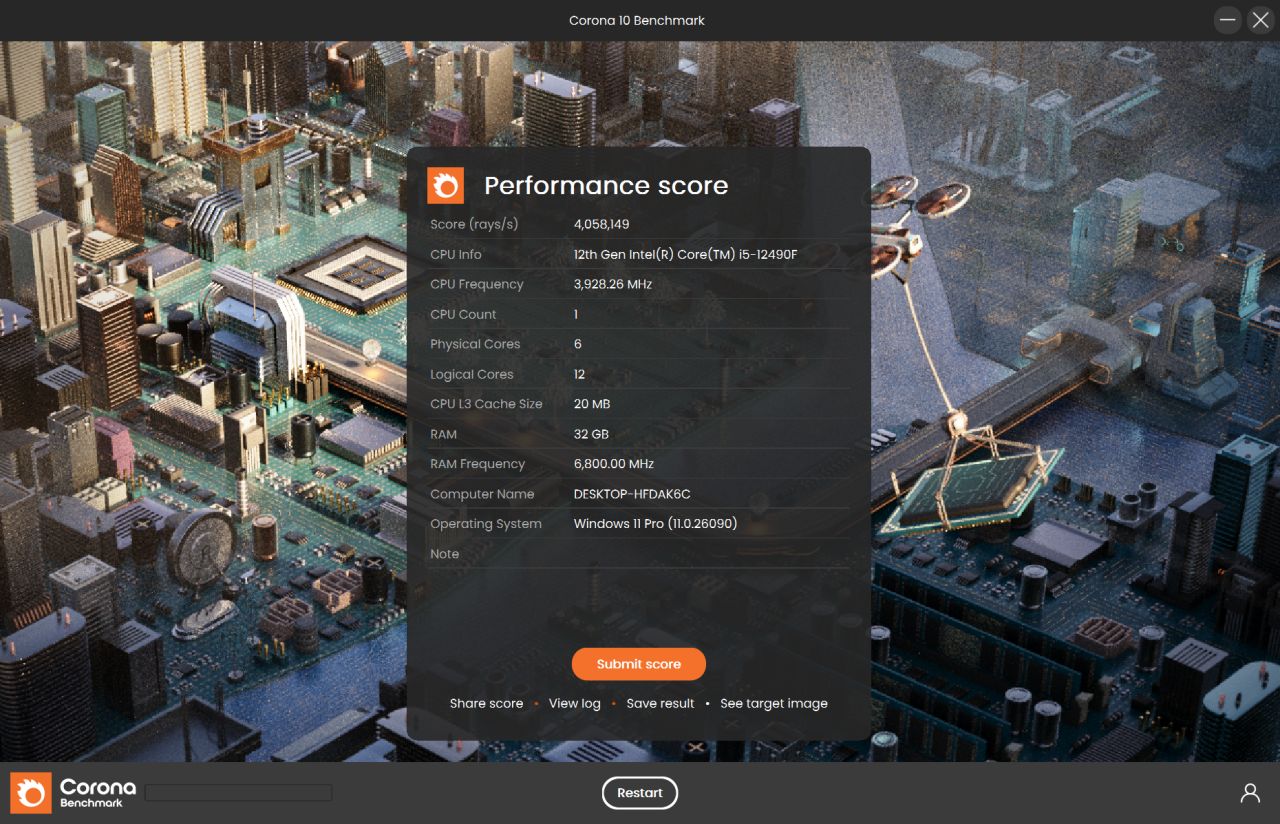 V-Ray 是由專業的渲染器開發公司 CHAOSGROUP 開發的渲染軟件,是業界最受歡迎的渲染引擎,其內核可應用在 3Dmax、Maya、Sketchup、Rhino 等多個軟件內。這裏咱們使用官方 Benchmark 基準測試,測得i5 12490F得分爲 13754 分: