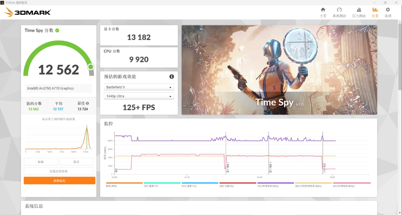 爲了評估整機的遊戲性能,使用 3DMark 進行了 2K 分辨率下的 DirectX 12 Time Spy 測試,默認情況這套平臺總體得分12562 分,其中i5 12490F的CPU 得分爲 9920 分。