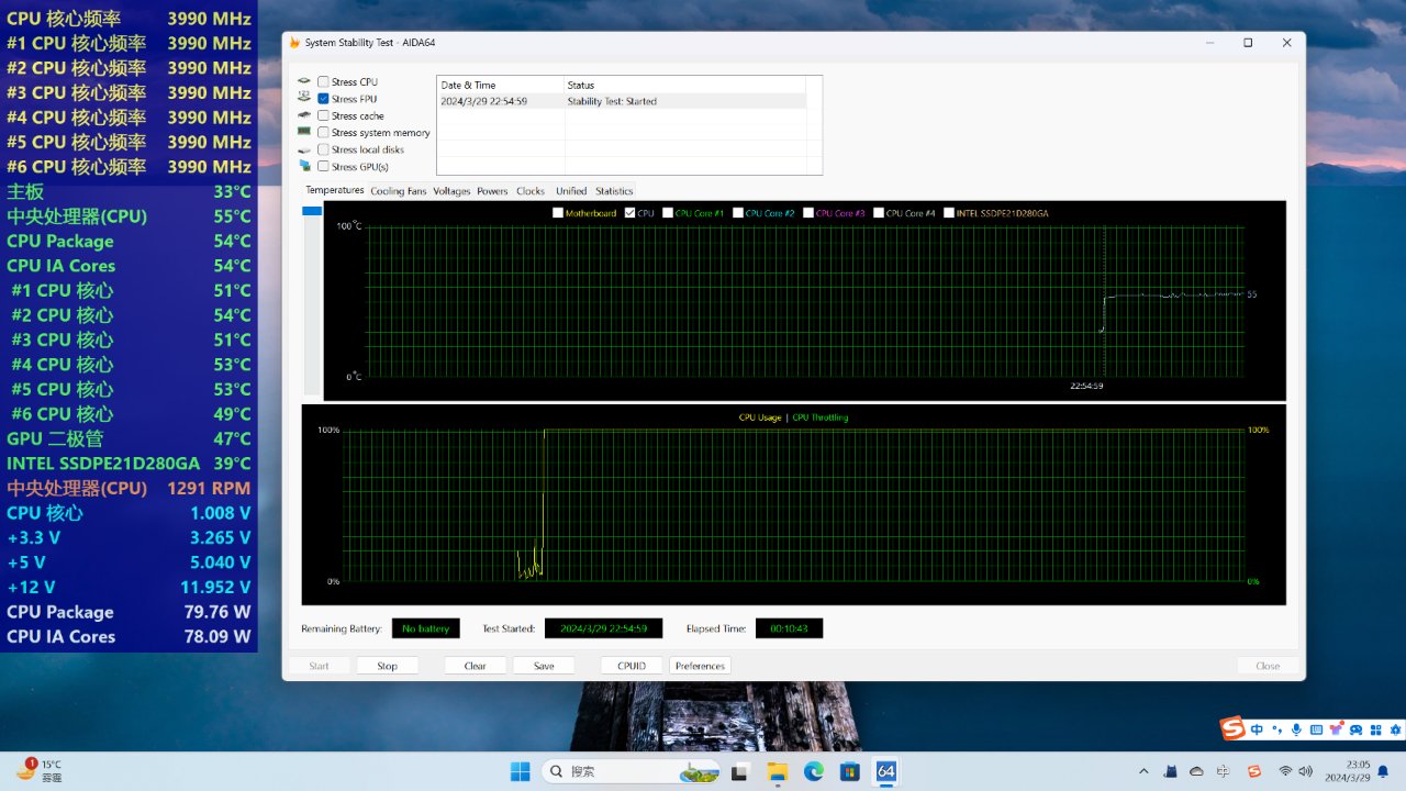 在未進入 BIOS 中調整的情況下,我手頭這塊Z790小雕X默認給CPU的電壓比較低,室溫26℃的情況下,使用 AIDA64 對i5 12490F進行10分鐘的單烤 FPU 操作,CPU 最高溫度也只有 53℃而已,相當涼快。