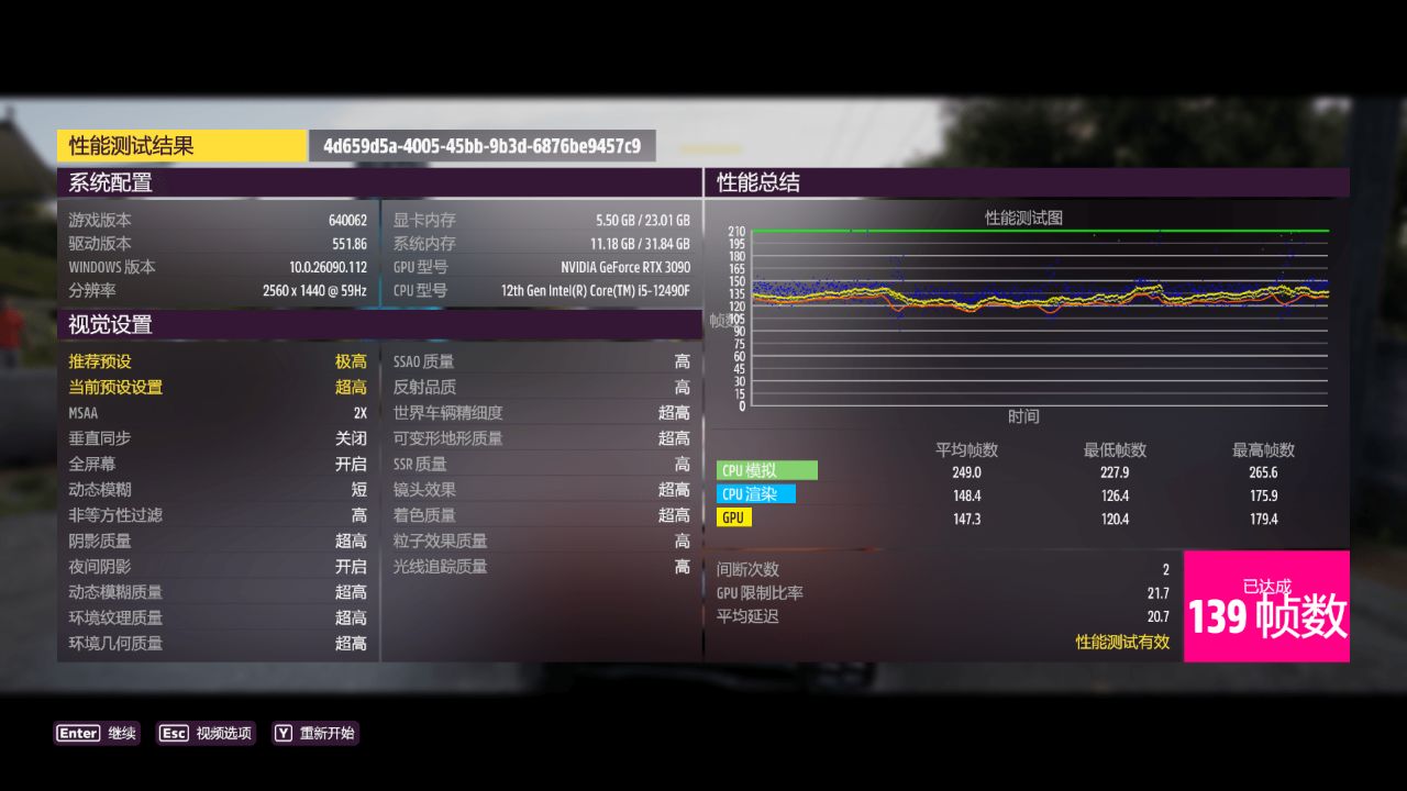 使用“超高”畫質檔位測試,測得 CPU模擬平均幀數爲 249幀,實際平均遊戲幀數爲139幀: